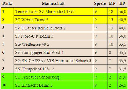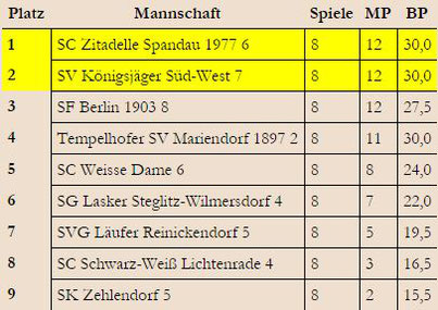 Dahinter folgen mit jeweils 4 MP die SF Nord-Ost Berlin III, die SC Weiße Dame V und die SG Weißensee 49 II.