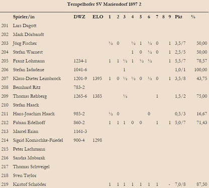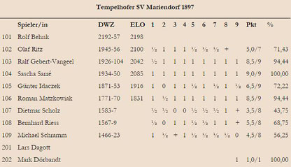 Ein hart erkämpfter Mannschaftssieg, dessen Wert sich auch noch steigerte, als die anderen Ergebnisse unserer Staffel im BMM-Skript einliefen. Unser nominell ärgster Konkurrent um den Aufstieg – SC Weiße Dame 5 – kam heute überraschend gegen den SC Eintracht Berlin III nicht über ein 4-4 hinaus und auch die SF Nord-Ost Berlin III mussten sich gegen den SK Tempelhof II überraschend mit einem 4-4 begnügen! Ferner musste die SG SK CAISSA / VfB Hermsdorf III sogar gegen die SG Weißensee 49 II bei der so nicht zu erwarteten 3-5 Niederlage „arg Federn lassen“!